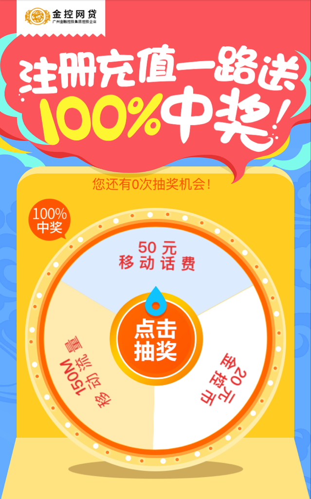 奖励设置:20元金控币、150M移动流量、50元移动话费,100%中奖