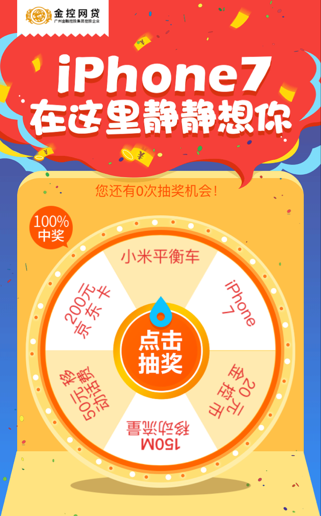 奖励设置:20元金控币、150M移动流量、50元移动话费、200元京东卡、小米平衡车、iPhone 7(128G)