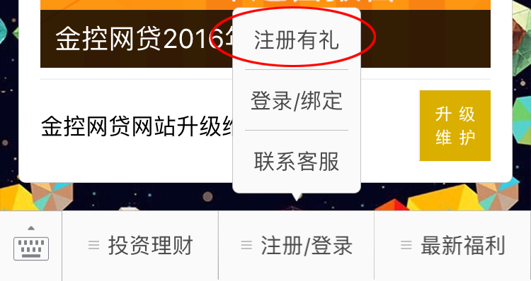 1.关注金控网贷服务号(jinkongp2p),点击菜单栏「注册/登录」→「注册有礼」;