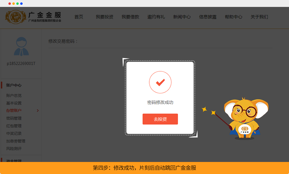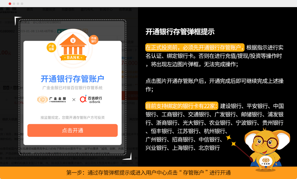 第一步:通过存管弹框提示或进入用户中心点击“存管账户”进行开通