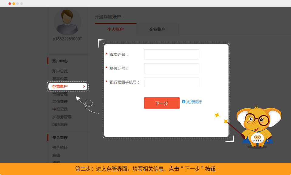 第二步:进入存管界面,填写相关信息,点击“下一步”按钮