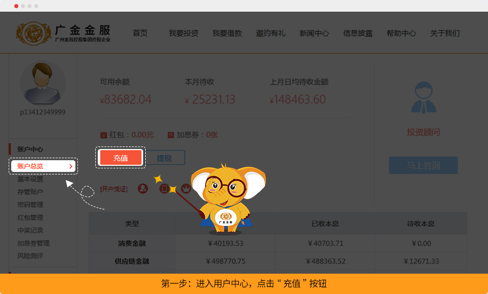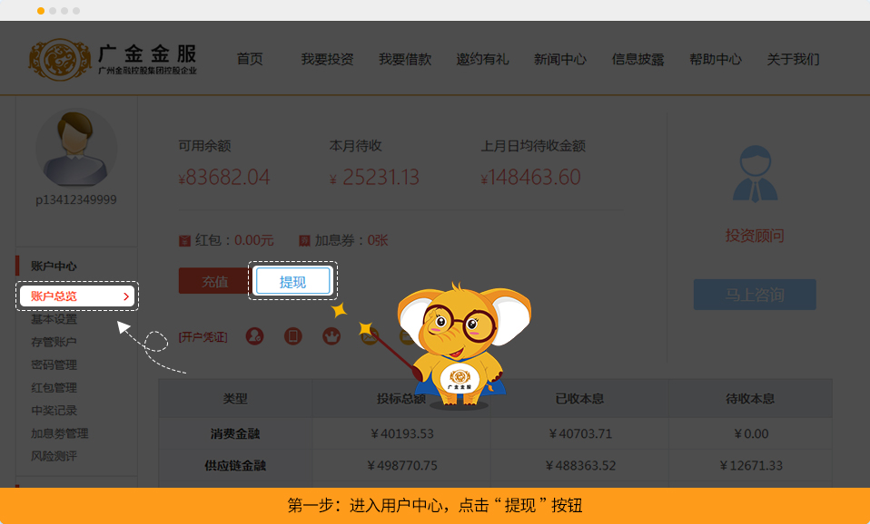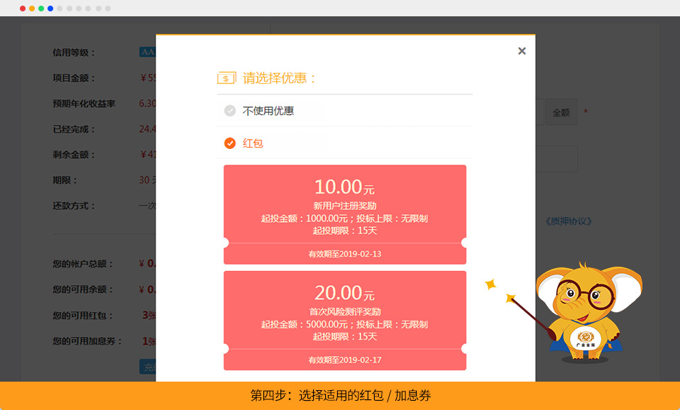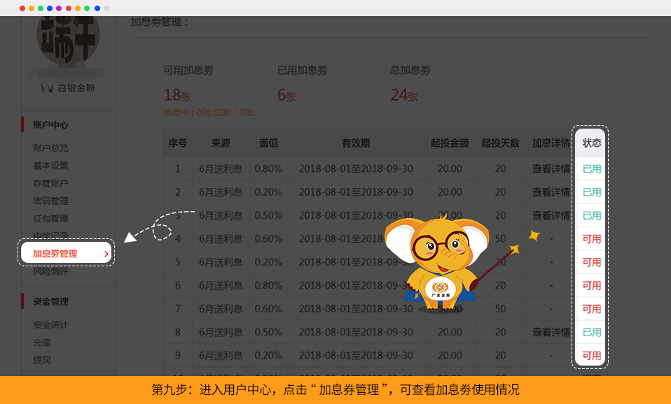 第九步:进入用户中心,点击“加息券管理”,可查看加息劵使用情况