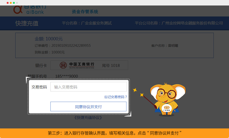 第三步:进入银行存管确认界面,输入交易密码,点击“同意协议并支付”