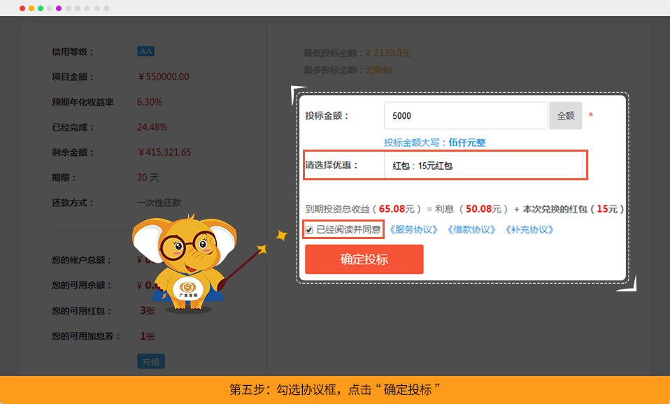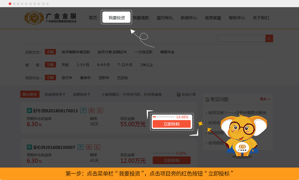 第一步:点击菜单栏“我要投资”,点击项目旁的红色按钮“立即投标”