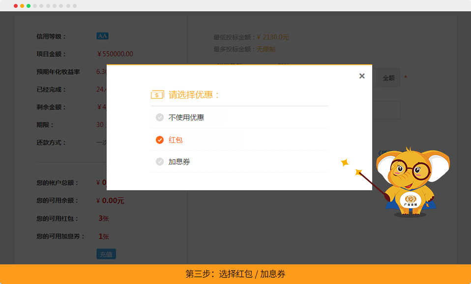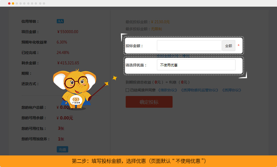 第二步:填写投标金额,选择优惠(页面默认“不使用优惠”)
