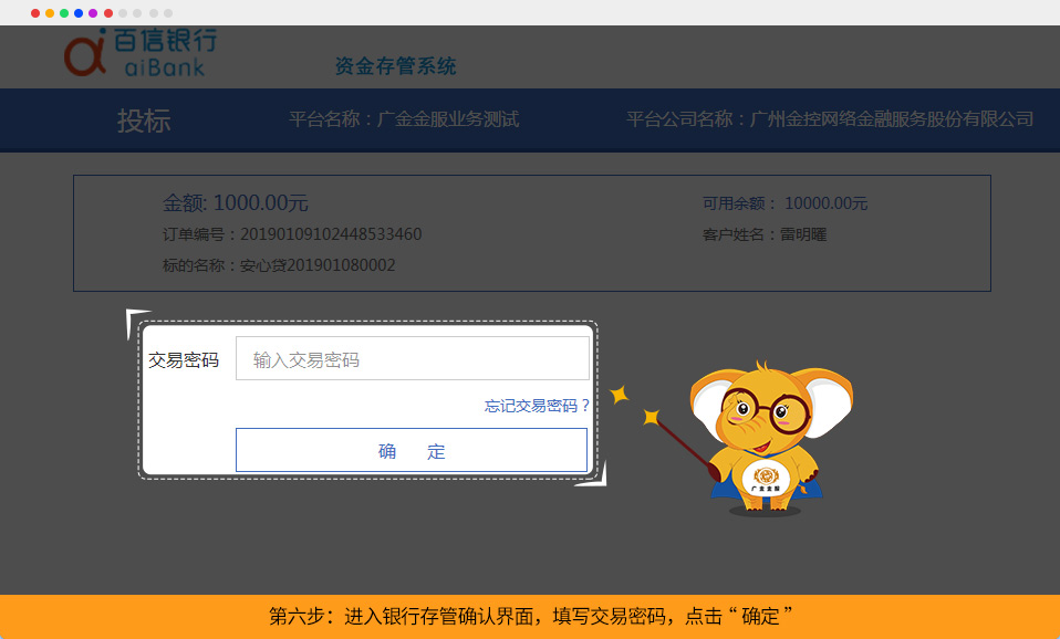 第六步:进入银行存管确认界面,填写交易密码,点击“确定投标”