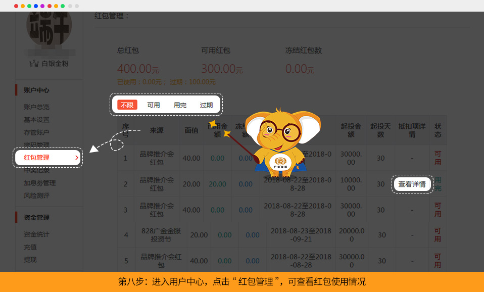 第八步:进入用户中心,点击“红包管理”,可查看红包使用情况