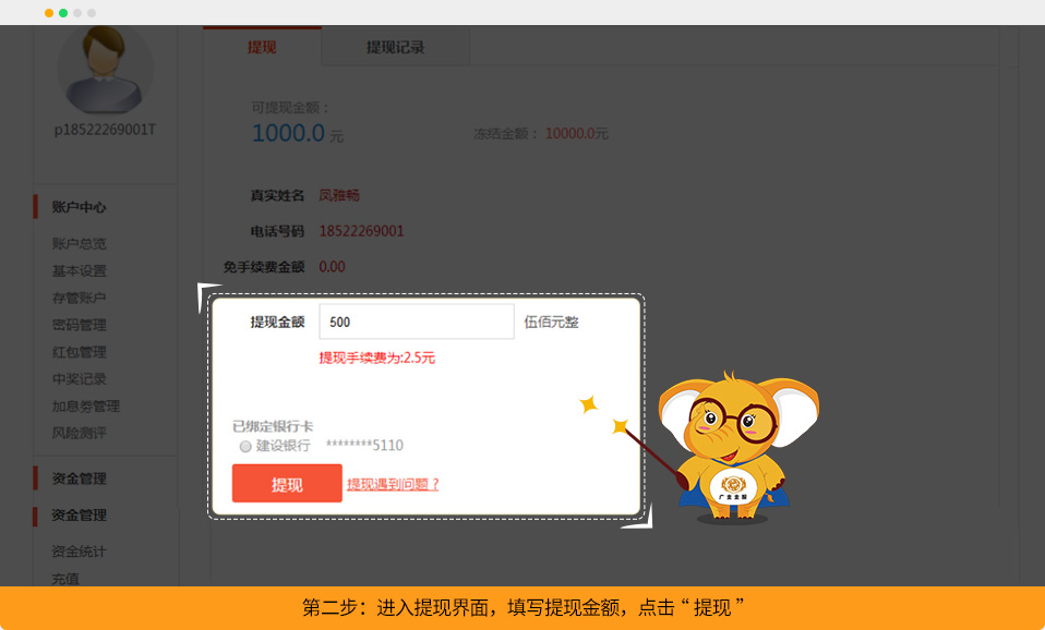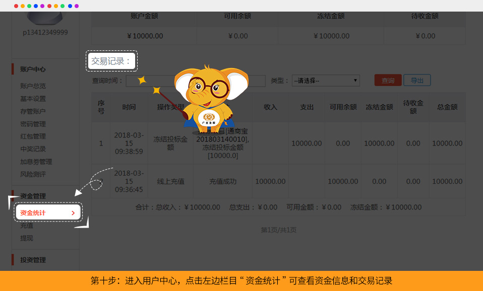 第十步:进入用户中心,点击左边栏目“资金统计”可查看资金信息和交易记录