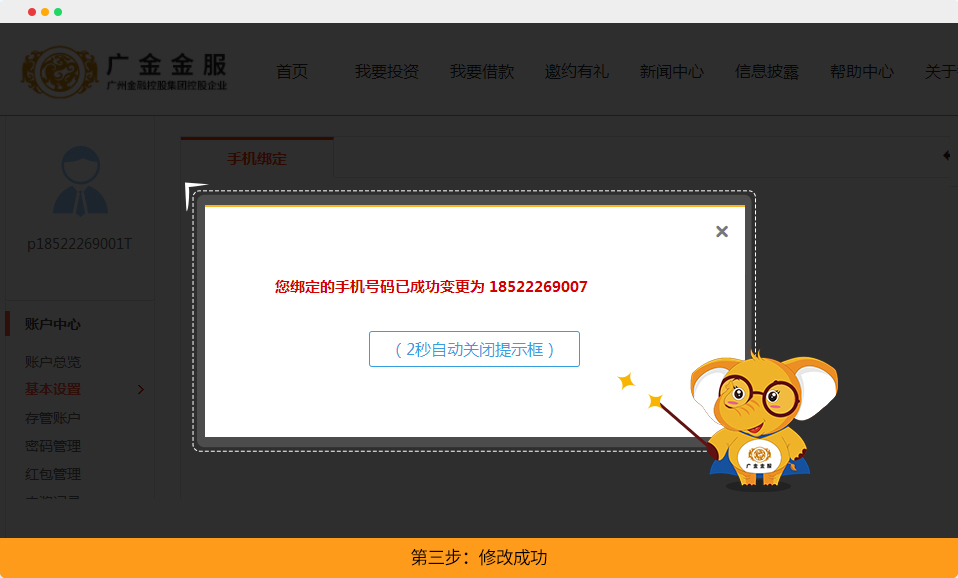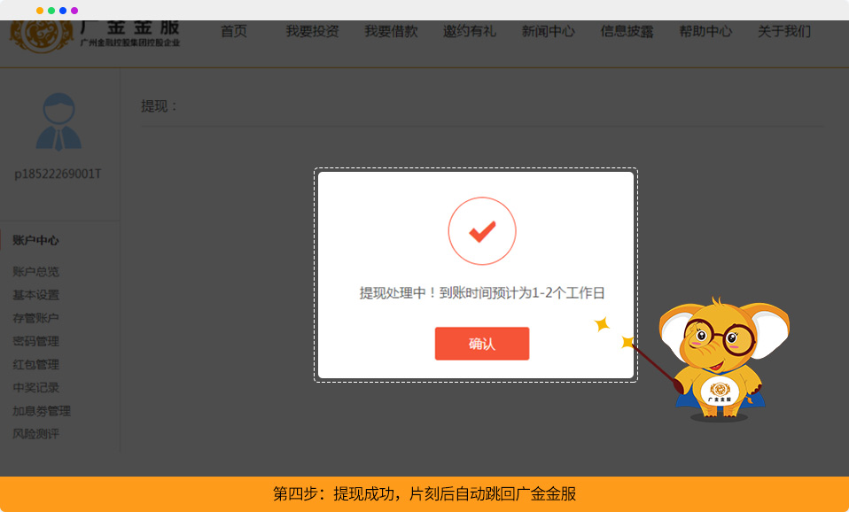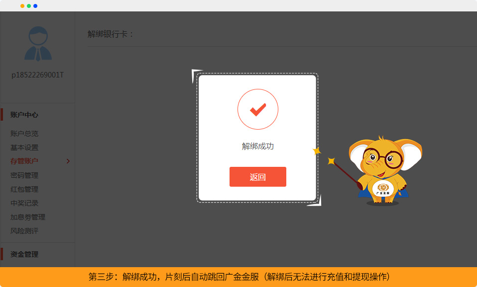 第三步:解绑成功,片刻后自动跳回广金金服(解绑后无法进行充值和提现操作)