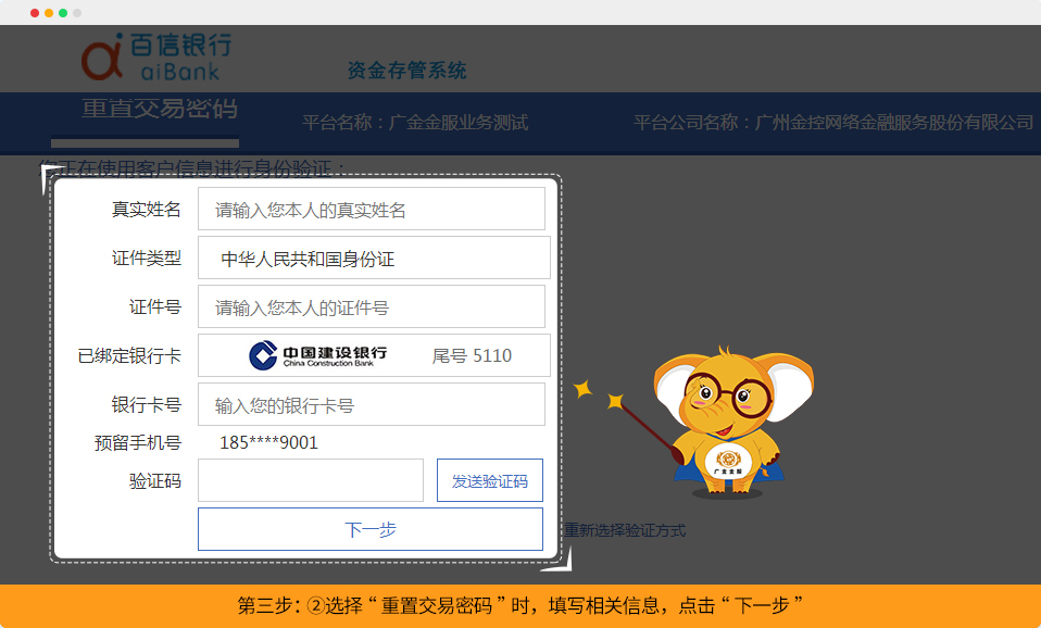 第三步:②选择“重置交易密码”时,填写相关信息,点击“下一步”