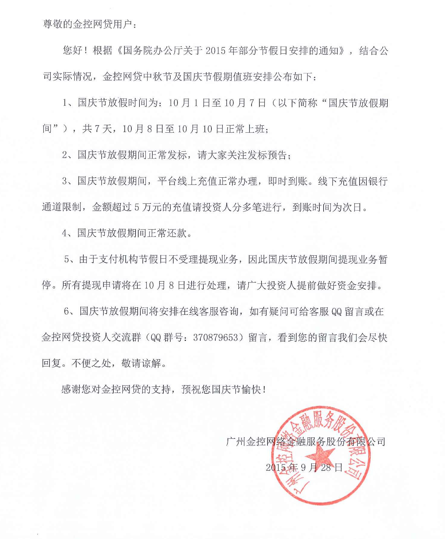 - 金控网贷2015年国庆节放假值班安排
