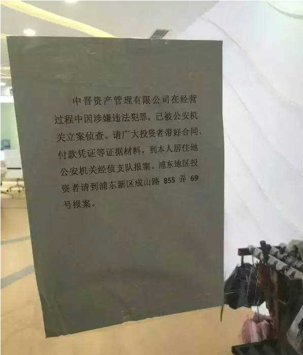 “中晋资产管理有限公司在经营过程中因涉嫌违法犯罪,已被公安机关立案侦查。”这是在中晋营业网点玻璃门上的一张公示。