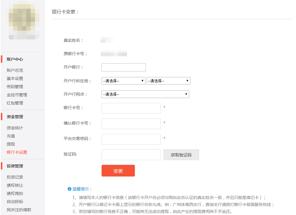 点击【申请变更】后进入银行卡变更页面,添加可直接认证的银行卡。