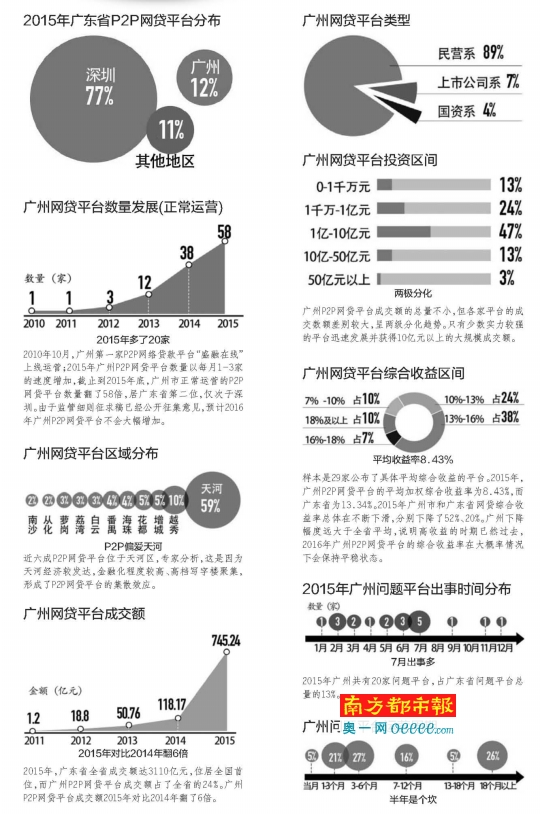 ·互联网金融强势插入我们的生活,P2P网络贷款平台亦茂密生长。伴随而来的,则是日渐增多的资金链断裂、平台跑路、投资泡汤等等问题,让普通市民心悸。比如上月底,因非法集资,P2P网贷平台“在线贷”所属的深圳“鼎丰在线”董事长何某等4人被批捕,据警方通报,该公司吸收公众原始本金1.09亿元人民币,现无法收回返还。广州的P2P网贷平台又是怎样一种景象呢?本期南都数据逐一解析。