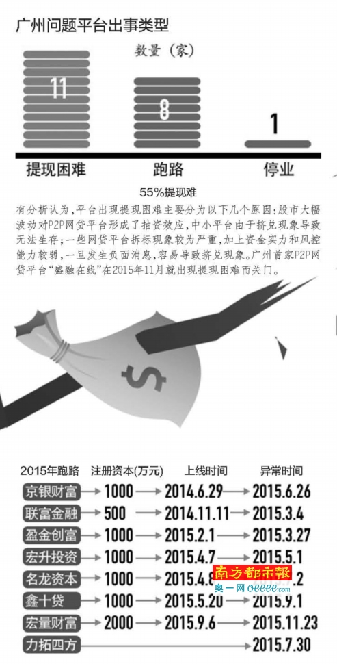 问题平台是市民尤为关心的———2015年广州有20家P2P网贷平台关门,占广东省问题平台总量的13%,其中8家跑路。数据显示,截至2015年底,全国共出现896家问题平台,55%是跑路。