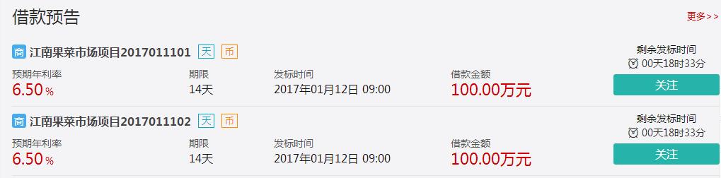 而金控网贷(www.yueshangbang.cn),也在这个时候,积极为投资人提供优质的,期限多样的标的项目,有短期15天的,为过年的红包钱再加一把力,有1年的,让今年的年终奖多出一小月工资来,有半年的,适合新的一年可以让自己多一次旅行,总之,总有一款适合您的。明天12号9:00am,仍有两款通商宝的项目发布,总额度100万,期限14天,预期年化收益6.5%,快来给年终奖再添砖加瓦吧!