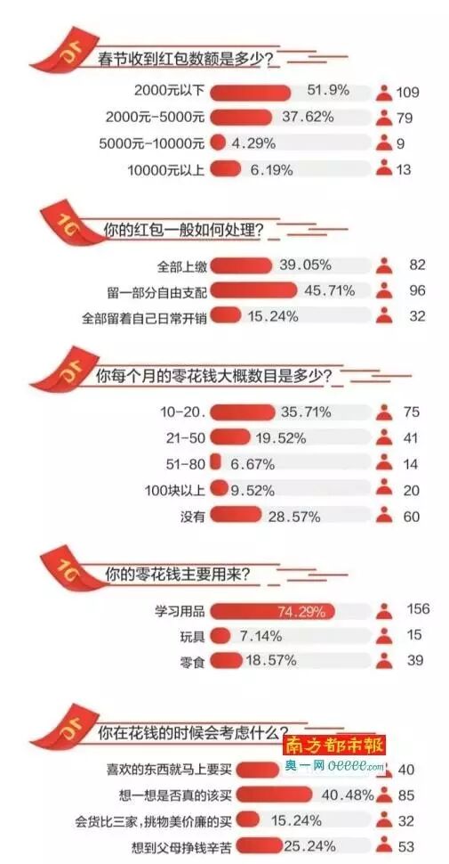 春节红包如何处理?调查数据显示,选择“全部上缴”的小学生占总人数的39 .05%,“留一部分自由支配”占45.71%,“全部留着自己日常开销”占15.24%。也就是说,超过七成的小学生能自己支配使用收到的红包。