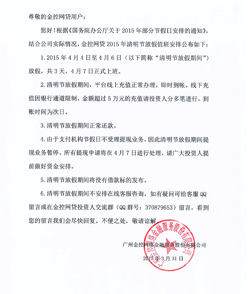 - 金控网贷2015年清明节放假值班安排