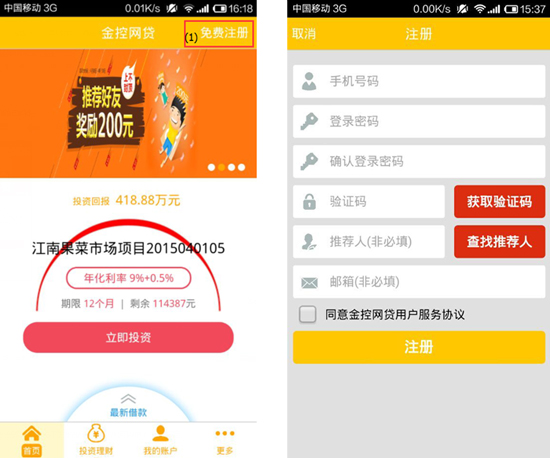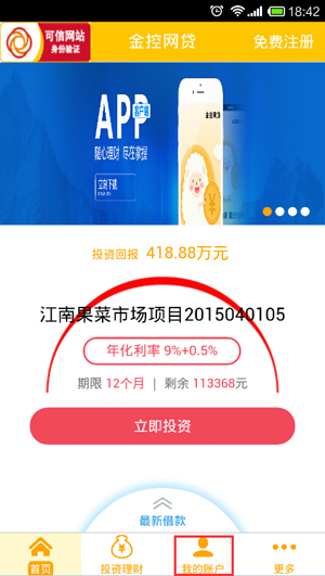 金控网贷App目前仅供安卓系统手机使用,目前主要有注册、登陆、投标、查看四项功能,后续我们将不断进行优化和完善,以实现更多的功能,提供更好的移动理财体验,敬请大家期待!