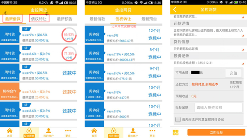 ① 投资页面有三类,分别是“最新借款”、“债权转让”、“最新预告”,目前债权转让专区仅供查看,无法竞拍;