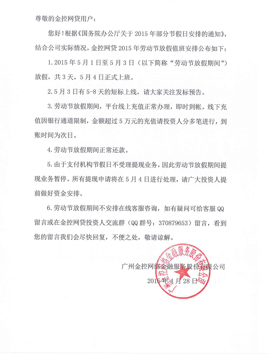 - 金控网贷2015年劳动节放假值班安排
