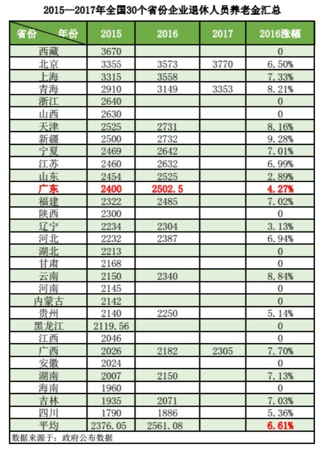 小力据目前已有的公开数据显示,养老金均已超过3000元只有四个城市:西藏、北京、上海、青海,其中北京居于榜首,2017年公布为3770元/月;全国垫底城市为四川,2015年、2016年企业退休人员月均养老金均未超过2000元。大家最为关心的广东,2016年公布的数据为2502.5元,涨幅为4.2%。