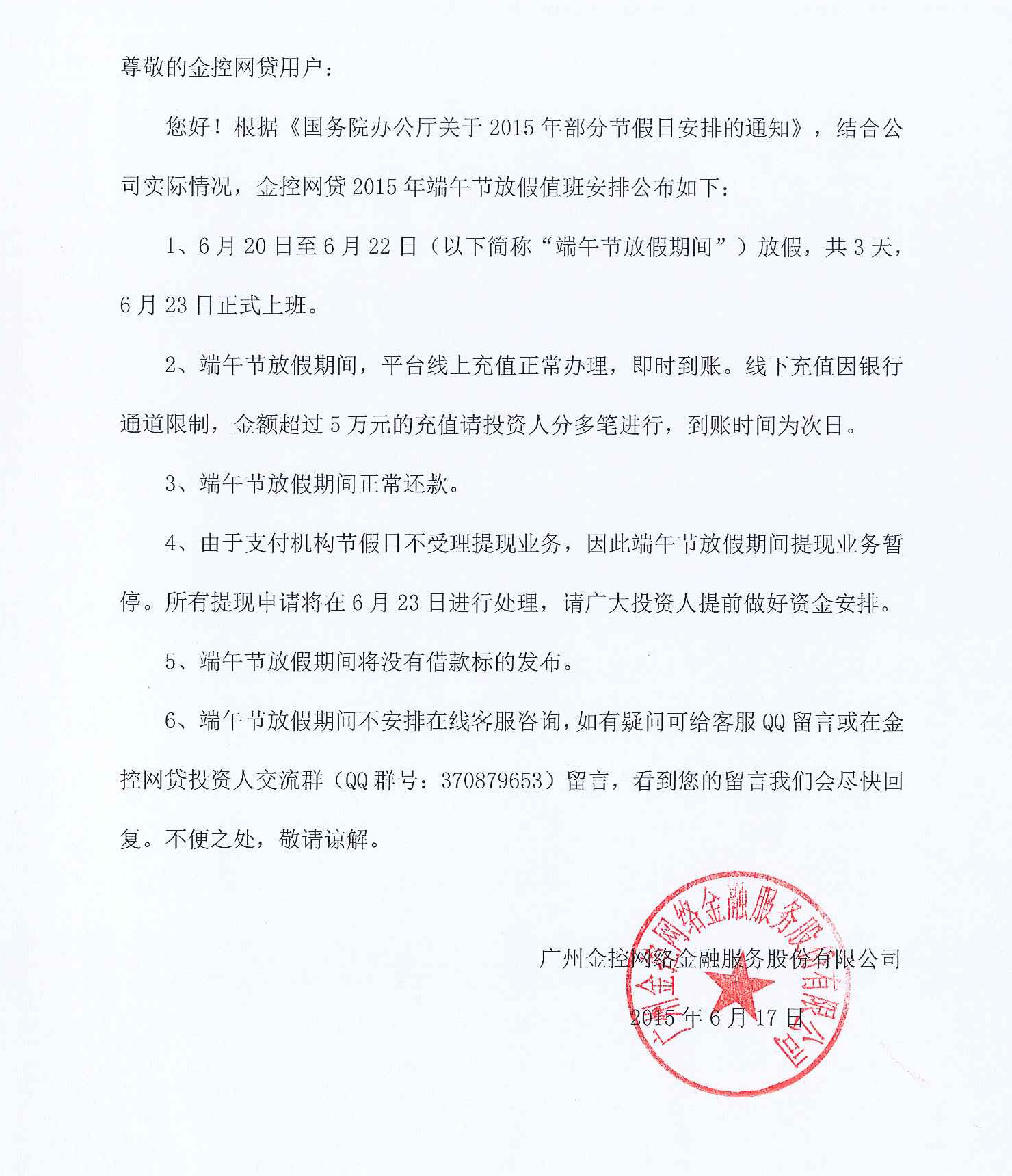 - 金控网贷2015年端午节放假值班安排