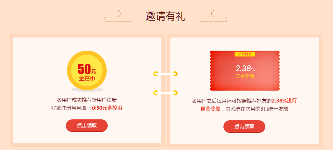 即日起至3月底,老用户推荐好友注册,即送50元金控币,此后一年内还会有现金奖励哦~!