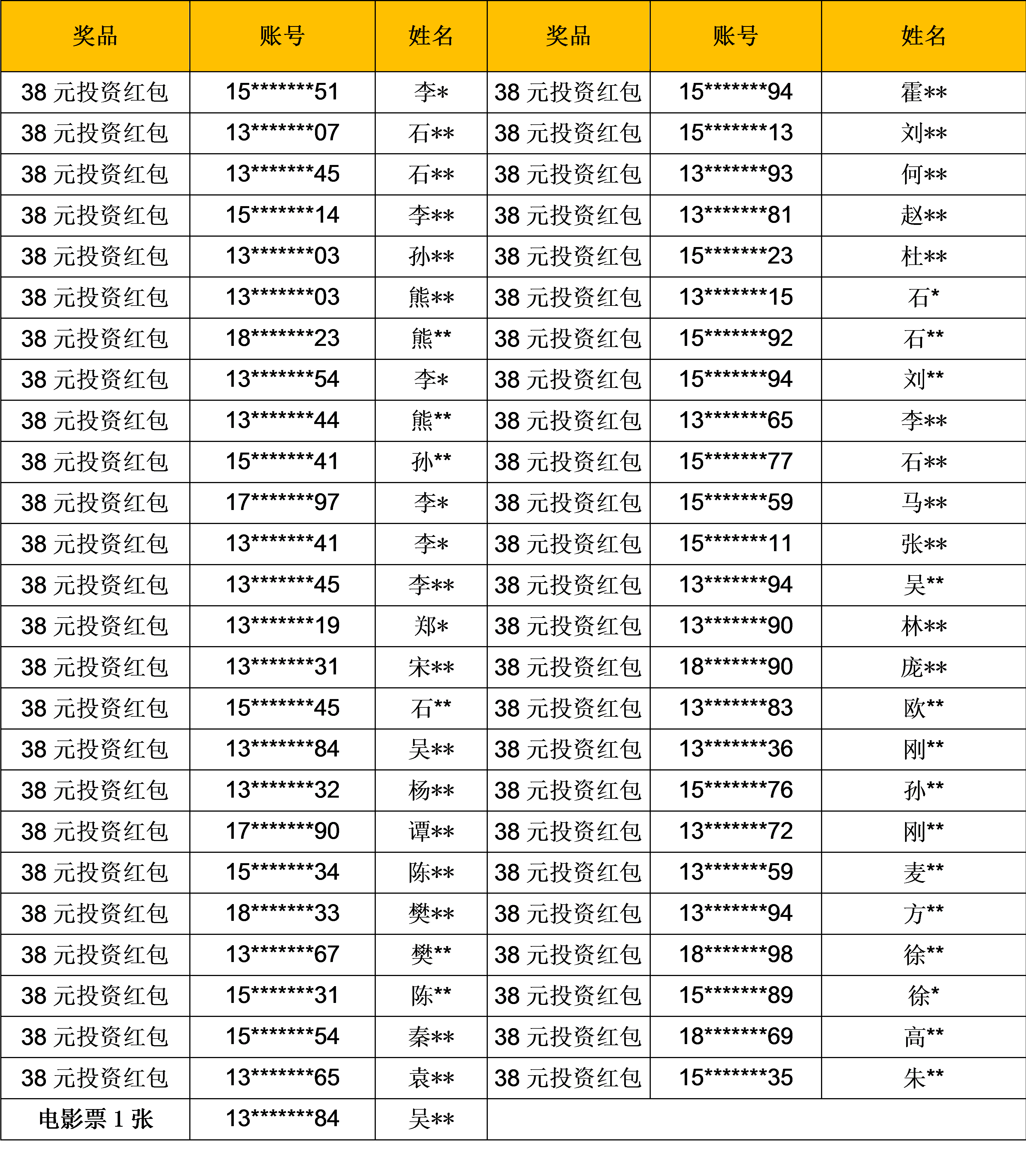感谢以上用户对本次活动的大力支持。38元投资红包后续将统一发放至获奖用户账户,届时将以短信进行通知。近期,金控网贷平台系统将全面升级为银行存管版系统。请获奖用户及时开通存管版账户以便在有效期内及时使用该红包(一个月有效期)。