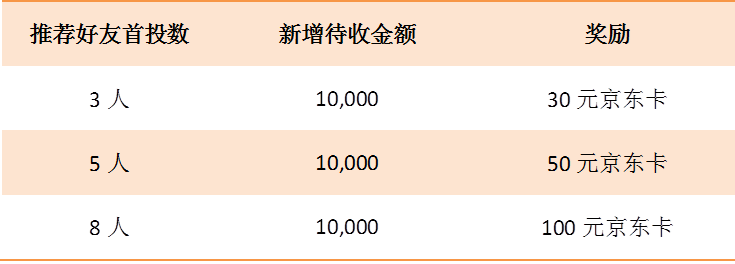 活动期间,凡推荐好友注册并首投,且好友在1周内新增待收金额≥1万元,新首投好友数量达到指定数量即可获得对应等级的京东卡啦!