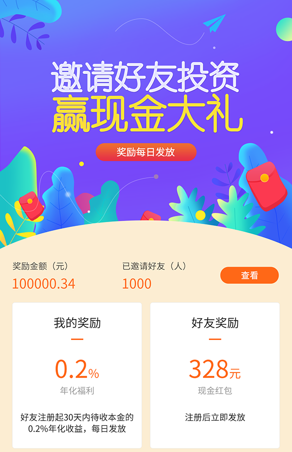 同时,为感谢广大金粉们一直以来的信赖与支持,借四周年生日之际,平台邀请好友奖励全面升级。即日起,用户邀请好友注册,好友即可获得328元的新手专享投资大礼包,同时,推荐人可获得好友投资年化0.2%的净待收提成奖励,奖励每日发放,天天有惊喜。