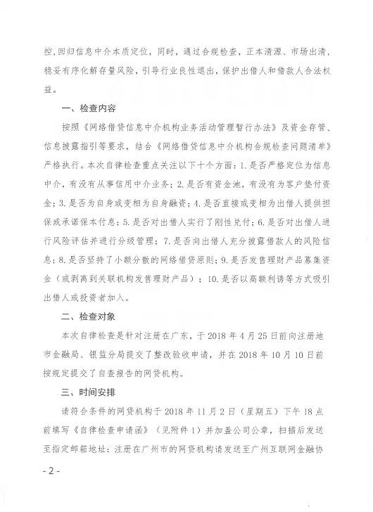 10月30日,广东省互金协会发布了《关于开展广东省P2P网络借贷信息中介机构自律检查的通知》,以下简称(《通知》)。